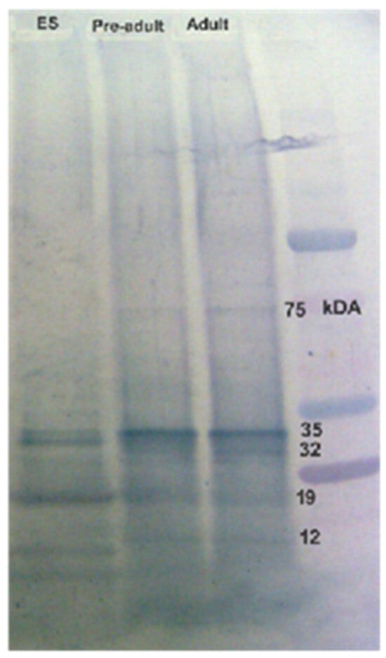 Excretory–secretory (ES) protein antigens of P. westermani type 1 resolved in 12% Tris-Glycine SDS-PAGE.