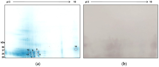 Briefly, the stained gel was first washed with miliQ water twice followed by the excision of protein spots of interest. The gel pieces were diced into small pieces and further destained using an ammonium bicarbonate (NH4HCO3) solution and acetonitrile (1:1 ratio). Next, the gel pieces were dehydrated using acetonitrile until completely dry. The gel particles were rehydrated in freshly prepared 10 mM dithiothreitol (DTT) in 100 mM ammonium bicarbonate solution and incubated for 1 h at 56 °C in water bath. After incubation, the DTT was removed and the gel pieces treated with freshly prepared 55 mM iodoacetamide (IAA) in 100 mM of NH4HCO3 solution for 45 min. The supernatant was removed and the gel pieces were incubated with NH4HCO3 solution for 10 min. After the gel pieces had shrunk, the supernatant was removed and the gel was again dehydrated with acetonitrile for 10 min and vacuum-centrifuged until completely dry. Subsequently, 10 µL of freshly prepared trypsin solution (10–20 ng/µL in NH4HCO3 solution) was added to tubes containing the gel pieces and kept for overnight incubation at 37 °C. The solution was collected using centrifugation and transferred into fresh microcentrifuge tubes. The extraction buffer (acetonitrile and 0.1% trifluoroacetic acid = 1:1 ratio) was added to the gel pieces and sonicated for 20 min at room temperature. The fresh supernatant obtained using centrifugation was mixed with the previous supernatant. The supernatant collected was treated using a Speedvac until completely dry. The dried pepmix was resuspended in a solution containing acetonitrile and 0.1% trifluoroacetic acid (1:2 ratio). The peptides obtained were mixed with an α-Cyano-4-hydroxycinnamic acid MALDI matrix and the resulting 2 µL was spotted onto the MALDI plate. After air-drying the sample, it was analyzed on the MALDI-TOF mass spectrometry instrument and further analysis was undertaken with flex analysis software for obtaining the peptide mass fingerprint. The masses generated in the peptide mass fingerprint were submitted to MASCOT for protein identification against the Paragonimus Uniprot database [34].