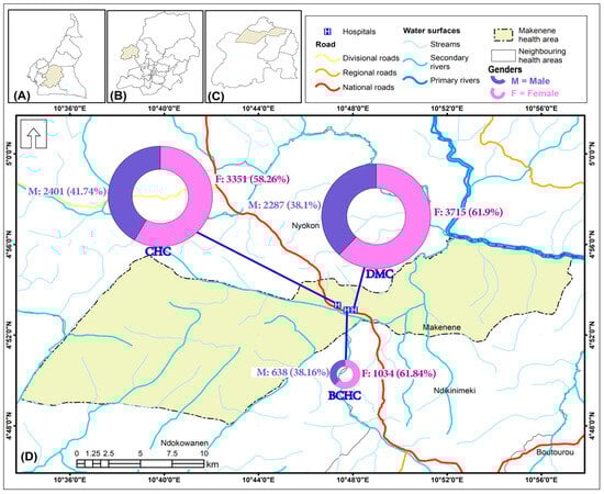 Map of the study site showing general malaria consultations by gender (2016–2020): (A) Cameroon, (B) Central Region; (C) Ndikinimeki health district; (D) Makenene health area.