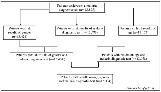 Data were entered into Excel 2016 spreadsheets, processed, coded, and imported into R software (R version 4.2.3, 10 January 2023) for analysis, following the flowchart of Figure 2. Patients with malaria-based diagnostic test results and variables such as age and gender were included in the analyses. Graphical analyses were performed to assess the trend of malaria prevalence per month for each year, as well as the trend of malaria prevalence per age group per month for each year, using the ggplot 2 package. Malaria prevalence was calculated by the ratio of positive cases out of the total number of patients per month during each year and per age group per month yearly. The difference in exposure to malaria was estimated through odds ratios and associated 95% confidence intervals from the logistic regression model. The analyses were considered significant at a significance level of 0.05.