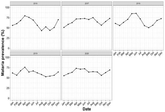 Annual trends in malaria prevalence slightly varied from 2016 to 2020 (Figure 3) (65.17% in 2016; 66.73% in 2017; 68.08% in 2018; 63,17% in 2019; 65.29% in 2020), with no significant difference observed (χ2= 12, p = 0.14). The monthly variation in the prevalence was noticed over the first years: The highest prevalence peaks were found during May and June (84.74% and 85.42%, respectively) in 2018 and in April 2016 (79.56%). The lowest prevalence peaks were found in August and October 2016 (43.09% and 43.75%, respectively).