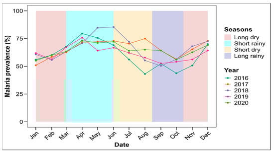 A seasonal variation in malaria prevalence was observed over the 5 examined years, with a significant difference (p < 0.0001) (Figure 4). The highest malaria prevalence was observed during the short rainy season, whatever the year (with the peak obtained during year 2018), while the lowest prevalence was observed during the long rainy season, whatever the year (Figure S1B).