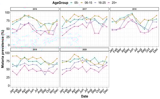 The prevalence of malaria was grouped by age according to time and is presented in Figure 5. Irrespective of the year, malaria’s prevalence varied monthly within each age group. The highest prevalence was found in the age groups of 6–15 (80.44%) and 0–5 (74.61%), while the age group >25 years had the lowest prevalence (Figure S1B).
