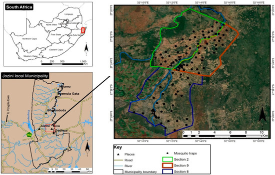 The mosquito samples used were obtained from archived storage, collected between 1 January 2015 and 31 December 2016 (called “archived samples” in this study), and female An. funestus group samples collected between May 2017 and June 2019, called “newly collected samples” in this study. Samples from January 2017 to 30 April 2017 were unavailable for this study, as they were used for the sterile insect technique (SIT) project. All the mosquito samples used in this study were collected from Mamfene, northern KwaZulu-Natal Province, South Africa (Figure 1). Specifically, the samples were collected from three sections in Mamfene (Sections 2, 8 and 9), which are being used as sentinel sites for entomological surveillance for the SIT study [6]. Adult Anopheles mosquitoes were collected from outdoor clay pots, carbon dioxide traps, outdoor buckets, and tyres as detailed by Dandalo et al. [6], and preserved for later analysis on desiccant (blue indicator silica gel).
