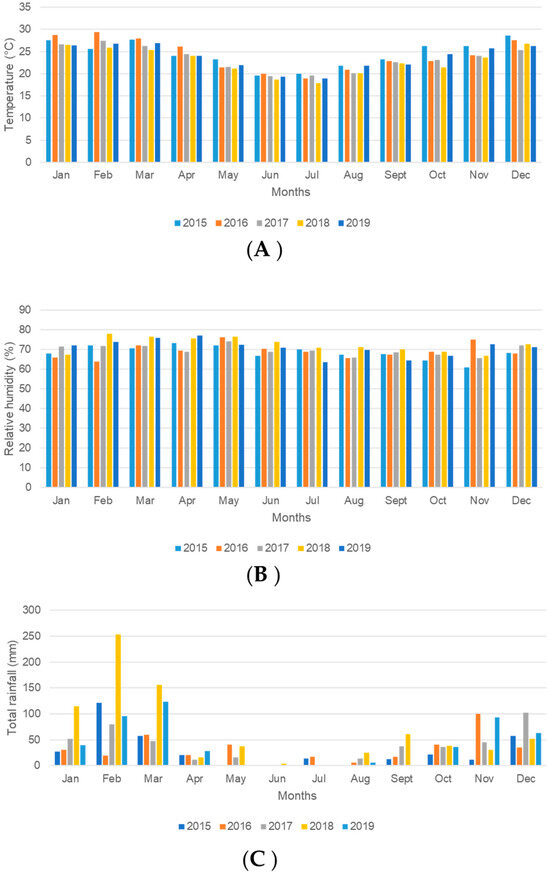 Temporal trend of three climatic parameters by month and year in Mamfene, KwaZulu-Natal Province, South Africa. Average monthly values for January 2015–December 2019. (A) Temperature (°C), (B) Relative humidity (%), (C) Total monthly rainfall (mm).