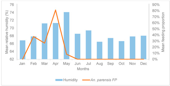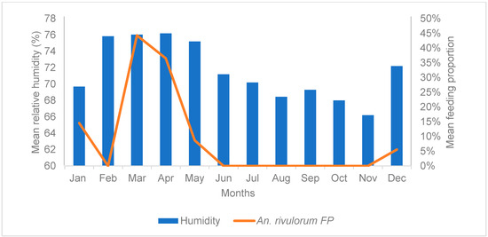 The mean FPs for An. rivulorum did not statistically differ between the archived and the new period (Mann–Whitney U test, U = 67.000, Z = −0.260, p = 0.765). However, FPs of An. rivulorum showed a strong positive correlation with mean monthly relative humidity in the new period (Pearson correlation, r = 0.655, p < 0.05, 95% CI) (Figure 6, Supplementary Table S5). The highest FPs were recorded during autumn, 44% in March and 37% in April, corresponding with the highest relative humidity values, >76% for both months (Figure 6).