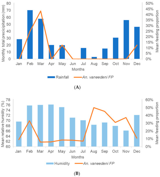 Mean monthly FPs of Anopheles vaneedeni and climatic parameters in Mamfene, KwaZulu-Natal Province, South Africa. (A) Mean monthly FPs of An. vaneedeni and mean monthly rainfall in the archived period (January 2015–December 2016). (B) Mean monthly FPs of An. vaneedeni and mean monthly relative humidity in the new period (May 2017–April 2019). FP = feeding proportion.