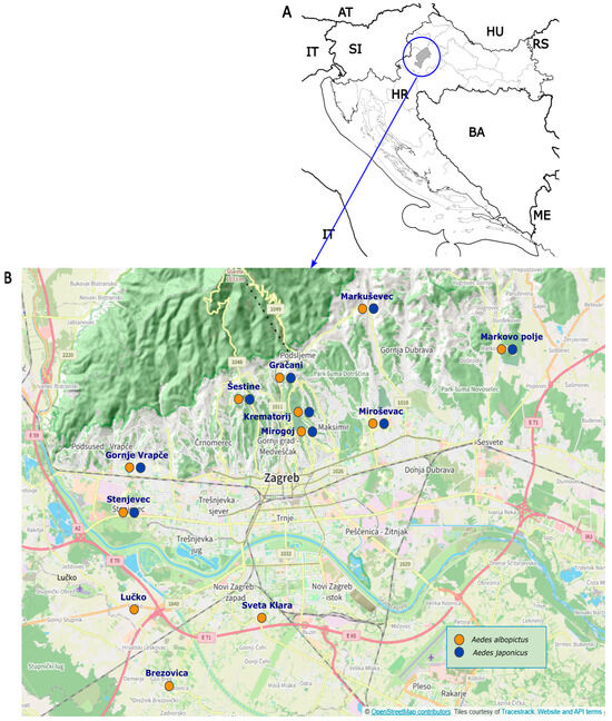 (A) The position of Zagreb city. Legend: HR—Croatia, IT—Italy, AT—Austria, BA—Bosnia and Herzegovina, HU—Hungary, ME—Montenegro, SI—Slovenia, RS—Republic of Serbia. (Created using: https://commons.wikimedia.org/wiki/File:Croatian_Counties,_Plain_Map_Colored.svg, accessed on 7 August 2024). (B) Distribution of Aedes albopictus and Aedes japonicus in cemeteries of Zagreb during 2018 (Created at: https://www.openstreetmap.org/search?query=Zagreb#map), accessed on 7 August 2024.