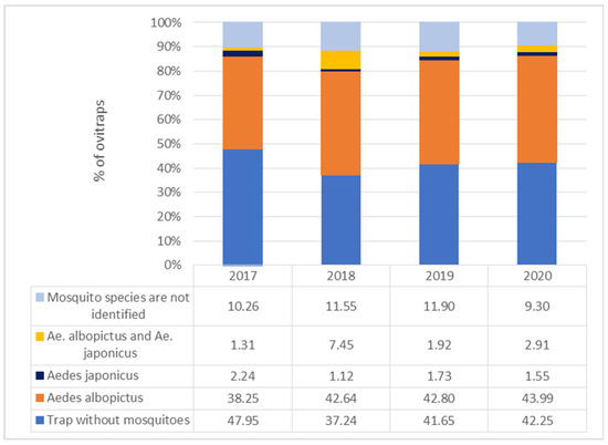 The species Ae. japonicus was recorded in a very low percentage of ovitraps (between 1.12% in 2018 and 2.24% in 2017) alone without cohabitation. Two invasive mosquito species, Ae. japonicus and Ae. albopictus, did not demonstrate a conspicuous pattern of cohabitation throughout the four-year period, showing very diverse results in these years, i.e., 1.31% in 2017 and 7.45% in 2018. In the subsequent years after 2018, the species showed decreased cohabitation, 1.92% in 2019 and 2.91% in 2020.