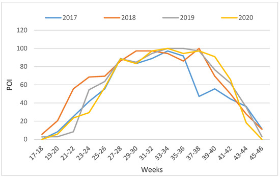 The distribution of Ae. albopictus and Ae. japonicus, expressed as the positive ovitrap index (POI), in the 12 cemeteries is presented in Figure 3. Data analysis showed that the POI was highest in the 33rd and 34th week of monitoring (second half of August) which was evident in all years except 2018 when the peak of activity was in the 37th to 38th weeks (mid-September). Additionally, in 2018, the POI was significantly higher in the spring, from the 19th to 24th weeks, than in other years.