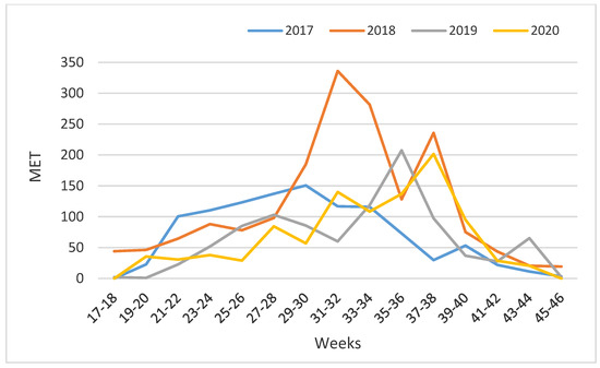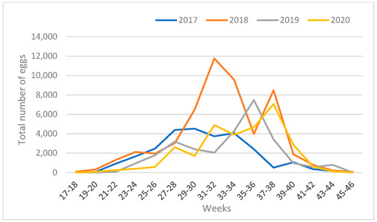 The average number of eggs per trap (MET) over a four-year period varied between zero (no eggs were recorded in three samplings) and 336 (a peak of activity in 2018). Analyzing the MET, it is noticeable that 2017, 2019 and 2020 were similar (Figure 4). More eggs were collected in 2018 compared to the other three years.