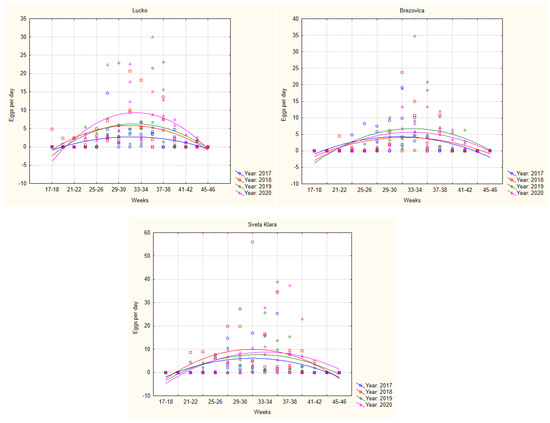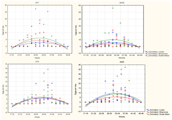 Regardless of the different number of eggs collected in each cemetery over four years, there was no significant difference (Lučko 2017–2020: 312.03, df = 3, MS = 104.01, F = 1.83, p = 0.22; Brezovica 2017–2020: SS = 77.3, df = 3, MS = 25.76, F = 0.72, p = 0.57 and Sveta Klara 2017–2020: SS = 147.85, df = 3, MS = 49.29, F = 0.11, p = 0.95).