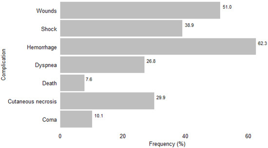 Overall, complications were observed in 42% (355/846) of patients with signs of envenomation (Figure 1). Among the envenomation cases, local complications (196/846, 23.2%) and systemic complications (290/846, 34.3%) were observed. Of the 355 patients with complications, hemorrhage (62.3%), bite-site wounds (51%), and shock (38.9%) were the most common. Death was reported at a frequency of 7.6% (27/355) (Figure 3).