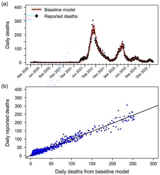 Baseline model fitting and validation of the model’s accuracy. (a) Comparison of reported daily deaths (black dots) and daily death counts generated by the baseline model (red line). The baseline model effectively captures the trends and peaks in COVID-19 mortality in Thailand. The shaded area represents the 95% partial likelihood-based confidence interval, indicating the uncertainty in the model estimates. (b) Scatter plot comparing the estimated deaths from the baseline model (x-axis) and the reported deaths (y-axis). Each blue dot represents a data point from the study period. The black line shows the linear regression between the estimated and reported deaths, with an R-square value of 0.9686.