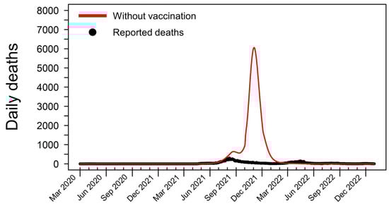 To assess the impact of vaccination on the pandemic’s trajectory, we simulated a counterfactual scenario in which no vaccination was implemented. Under this hypothetical scenario, the total number of deaths could have reached a staggering 333,886 by 31 December 2022, nearly ten times the actual reported deaths (Figure 2). The number of daily deaths in this scenario began to rise sharply in early June 2021, coinciding with the emergence of the Delta variant in Thailand. The peak of this simulated wave occurred on 3 November 2021, with 6061 deaths per day. This stark contrast between the baseline model and the counterfactual scenario underscores the critical role of vaccination in mitigating the loss of life during the COVID-19 pandemic in Thailand.