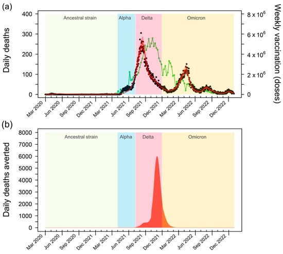 Impact of COVID-19 vaccination on mortality in Thailand. (a) The green line depicts the weekly vaccine doses administered in Thailand from 1 March 2021 to 31 December 2022. A substantial increase in vaccination rates is evident between July and November 2021, with a peak of 5.59 million doses per week in October 2021. This surge in vaccination coincides with a decline in reported daily deaths (black dots), highlighting the effectiveness of the vaccination campaign in reducing COVID-19 mortality. (b) Averted deaths due to vaccination, calculated as the difference between the projected deaths in the baseline model and a hypothetical scenario without vaccination. The graph illustrates the substantial number of lives saved by the vaccination efforts, particularly during the peak of the Delta variant’s transmission. The shaded areas represent the periods of dominance for different SARS-CoV-2 variants in Thailand: the Ancestral strain (1 March 2020 to 31 March 2021), Alpha variant (1 April 2021 to 7 June 2021), Delta variant (8 June 2021 to 30 November 2021), and Omicron variant (1 December 2021 to 31 December 2022) [18].