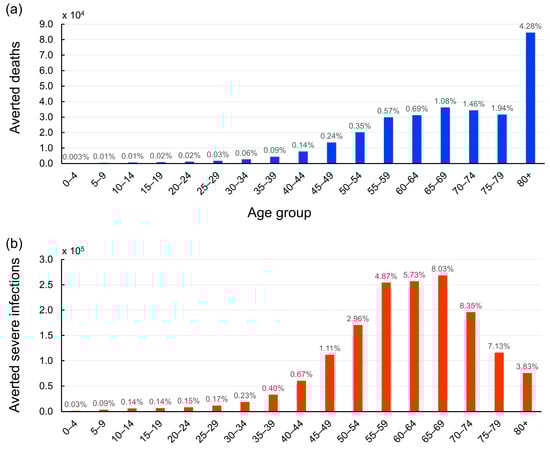 Figure 4 illustrates the impact of vaccination on averting deaths and reducing severe cases across different age groups. Our analysis reveals a clear trend: the protective effect of vaccination against COVID-19 mortality increases significantly with age. In particular, vaccination has played a crucial role in preventing 84,518 fatalities among individuals over 80 years old, equivalent to saving the lives of 4.28% of this age group (Figure 4a).