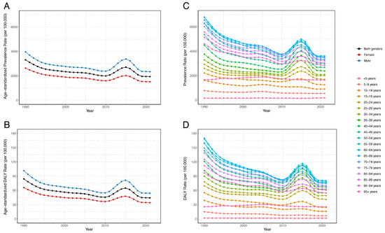 DALY counts decreased in younger age groups (under 45 years) and increased in most older age groups from 1990 to 2021. The most significant growth was observed among people at ages of 95 years and older, with a percentage increase of 1464.42%. However, the DALY rate declined in most age groups during this period. The largest decrease in the DALY rate occurred in the 5–9-year age group, with an EAPC of −2.31% (95% CI: −2.51% to −2.10%) (Table S2). Similarly to the trend in prevalence rates, most age groups experienced a temporary increase in DALY rates after 2010, followed by a decline, except for the very young (under 15 years) and very old people (95 years and older), where DALY rates remained relatively stable (Figure 1D).