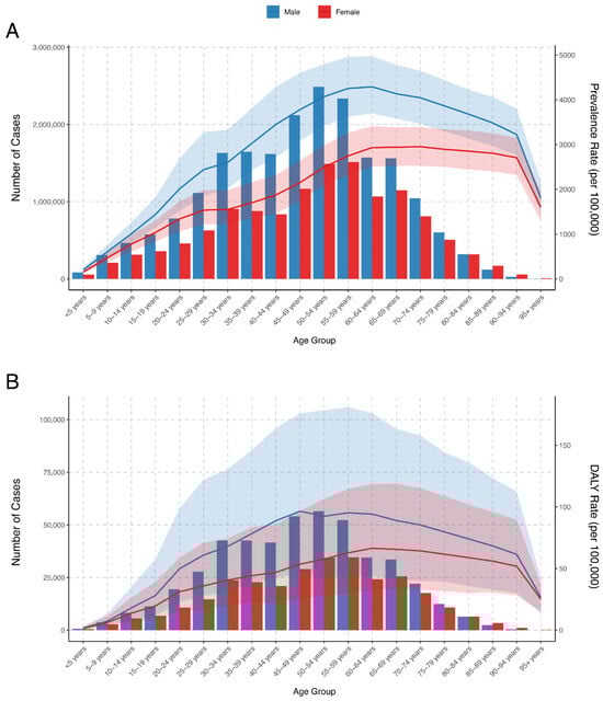 To quantify temporal trends in age-standardized and age-specific prevalence and DALY rates, the estimated annual percentage change (EAPC) was calculated using a linear regression model, where the natural logarithm of the value was regressed against the calendar year. The equation used was: y = α + βx + ε, where y represents the natural logarithm of the value, x indicates the calendar year, α is the intercept, β denotes the slope, and ε is the error term. The EAPC was then calculated as 100 × [exp(β) − 1], with its 95% confidence interval (CI) derived from the linear regression model.