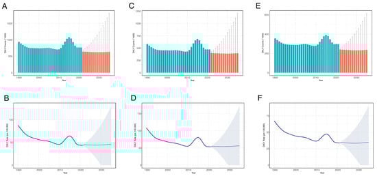 Prediction of age-standardized DALYs rates and counts for food-borne trematodiases in China from 2022 to 2035. (A,B) Both genders; (C,D) men; (E,F) women. The blue bars indicate observed values, and the red bars indicate predicted values. The shadows or error bars indicate the 95% CIs for the predicted rates and numbers. Abbreviations: DALY, disability-adjusted life years; CI, confidence interval.