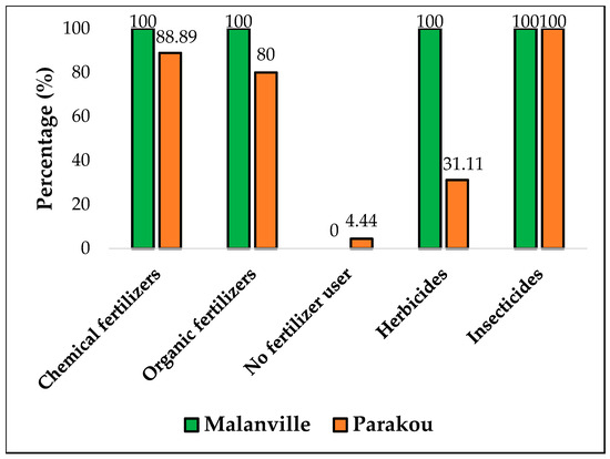 In Malanville, all the interviewed farmers used chemical fertilizers (100%), herbicides (100%), and pesticides (100%), while, in Parakou, farmers used 95.56%, 31.11%, and 100% of chemical fertilizers, herbicides, and pesticides, respectively (Figure 2). No significant difference was observed on fertilizers and pesticide use between the two localities (Fertilizer: X2 = 1.821, df = 1, and p = 0.177). However, a significant difference was observed between these localities on herbicide use (X2 = 43.374, df = 1, and p = 4.5204·10−11). Farmers (97.5% in Malanville and 93.33% in Parakou) believed that the use of chemicals increase the yield.