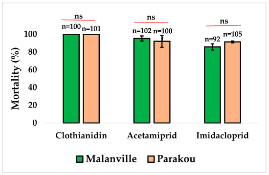 Mortality rate of An. gambiae s.l. from Malanville and Parakou exposed to neonicotinoids. Results are average percentage of mortalities from four replicates. N represents number of mosquitoes tested by insecticide. Error bar represents standard deviation, and ns means no significance with Mann–Whitney test.