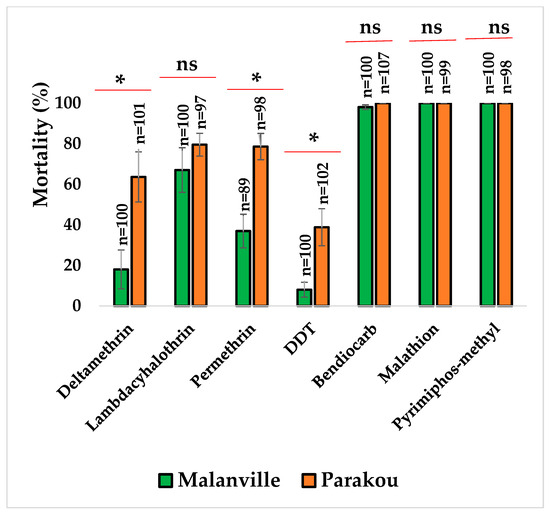 Insecticide resistance status of An. gambiae s.l. from Malanville and Parakou. Results are average percentage of mortalities from four replicates. N represents number of mosquitoes tested by insecticide. Error bars represent standard deviation. ns means no significance with Mann–Whitney test. * means a significant difference between the insecticide (Mann–Whitney test).