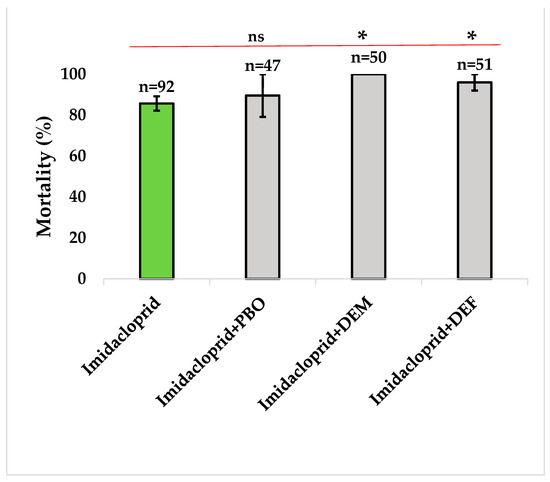 Bioassay with synergists combined with imidacloprid in An. gambiae s.l. collected from Malanville. Results are average percentage of mortalities from four replicates. n represent number of mosquitoes tested by insecticide. Error bar represent standard deviation. The stars (*) represent the significance level and ns means no significance. Green sticks represent insecticides and grey sticks represent synergists.