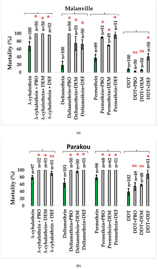 WHO bioassays showing the efficacy of insecticide in Malanville (a) and Parakou (b) with and without pre-exposure to the synergists (error bar represents standard deviations). n = number of mosquitoes tested by insecticide. The stars (*) represent significance level and ns means no significance. Green sticks represent insecticides and grey sticks represent synergists.