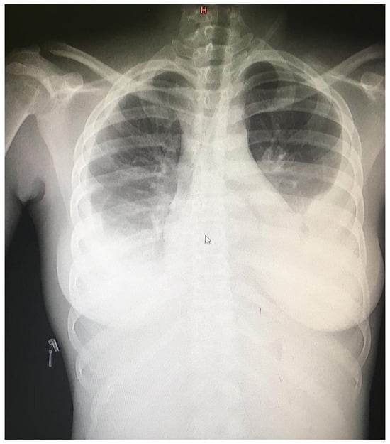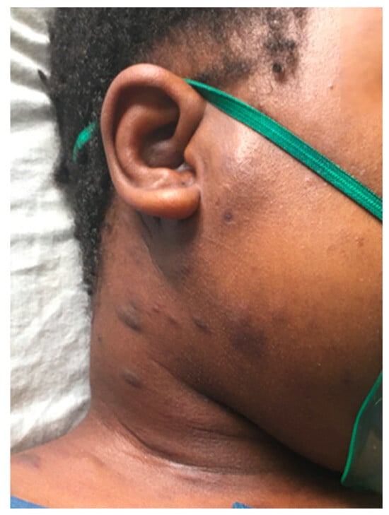 A 19-year-old HIV-positive woman presented with severe shortness of breath and dizziness. She had been on antiretroviral therapy (ART) for 16 years and had been followed at our institution for the past two years. ART non-adherence was likely, as multiple detectable HIV viral loads (between 250–16,000 copies/mL) were recorded during these two years. Her current HIV viral load was 8000 copies/mL and CD4 count was 49 cells/µL. The patient presented in acute distress, tachycardic (heart rate 137/min), hypotensive (blood pressure 90/60 mmHg), and hypoxic with an oxygen saturation (SpO2) of 68%. The patient weighed 51 kg, and the exam was notable for facial edema and KS lesions on the neck (Figure 1).