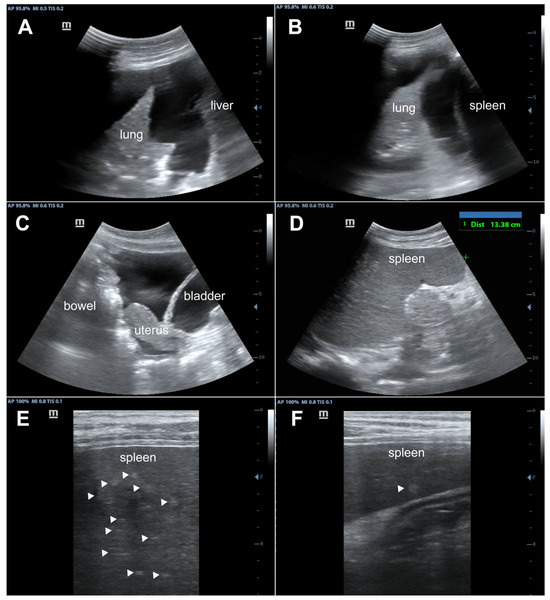 Point-of-care ultrasound performed on Day 2. Findings were consistent with disseminated KS, including right pleural effusion (A); left pleural effusion (B); pelvic free fluid (C); an enlarged spleen (D); and multiple hyperechoic splenic lesions (the arrowheads in E,F).