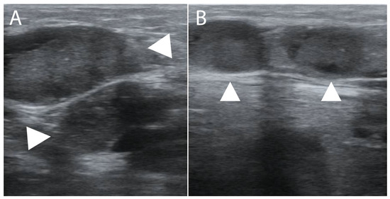 Multiple enlarged inguinal lymph nodes (arrowheads) were identified by ultrasound (A,B).
