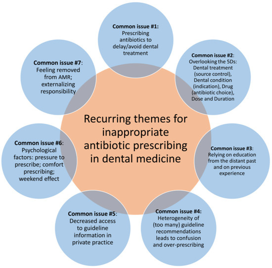 Through this literature review, we have identified seven common recurring themes of inappropriate antibiotic prescribing in dental medicine. These are illustrated in Figure 1 and described in detail below.