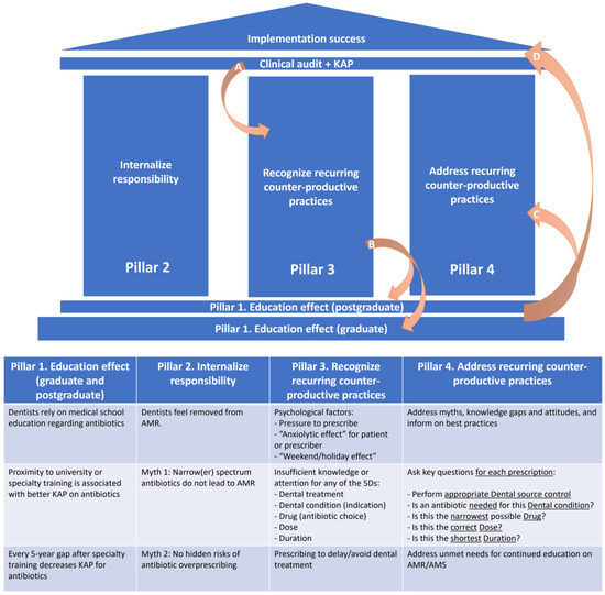 Furthermore, we have summarized these data into a proposed framework based on four key pillars of focused interventions, which interconnect to ensure the successful implementation of rational antibiotic prescribing practices in dental medicine (Figure 2). This framework can be used to develop tailored AMS interventions in different types of dental practices.