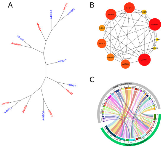 Computational analysis of the purine salvage pathway. Leishmanial homologs and the L. infantum APRT proteins’ phylogenetic tree. Sequences of L. infantum are represented by the blue labels, whereas those of L. braziliensis are represented by the red labels (A). Network diagram of the CytoHubba purine salvage pathway, where redder and larger nodes indicate a higher degree of centrality. Where Adenine phosphoribosyltransferase (ID: A4I1V1), Adenylosuccinate lyase (ID: A4HS40), Putative AMP deaminase (ID: A4I876), AMP deaminase (ID: A4IC17), Guanine deaminase (ID: A4I4E1), GMP synthase (ID: E9AGZ1), Adenylate kinase isoenzyme (ID: A4I5L5), Guanylate kinase-like protein (ID: A4IDK0), Adenosine kinase (ID: A4I5C0), and Adenosine kinase (ID: A4IAC6) (B). Sequence homology analysis, whereas the chord plots display the BLASTp results (C).