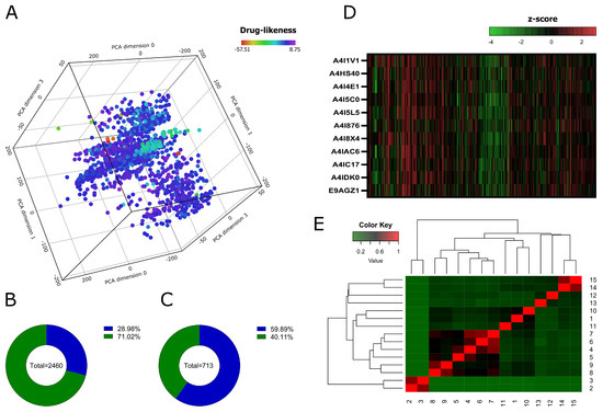 Molecular properties analysis and virtual screening. The chemical space of the generated dataset is represented visually by 3D-PCA (A). Pie charts show the analysis of Lipinski’s rule of five (B) and predicted toxicities (C) from the dataset. Heatmap showing the z-scores of the binding affinities of 428 compounds against the protein targets of the purine salvage pathway (D). Heatmap generated with Tanimoto scoring matrix of similar structures among compounds (E).