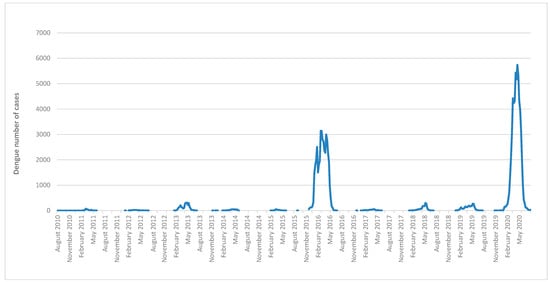 Confirmed dengue cases reported to the SNVS from EW 31 of 2010 to EW 30 of 2020 were considered for this analysis. Since 2018, the surveillance system has incorporated integrated clinical, epidemiological, and laboratory information, whereas in the past, cases were reported using two separate systems: one for clinical–epidemiological data and another for laboratory data. Thus, the system needed integration and preliminary analysis before case-counting. For this study, dengue cases up to the year 2018 were obtained in a grouped manner, matched up by EW, department, and age groups. Since the year 2019, information was reported individually.