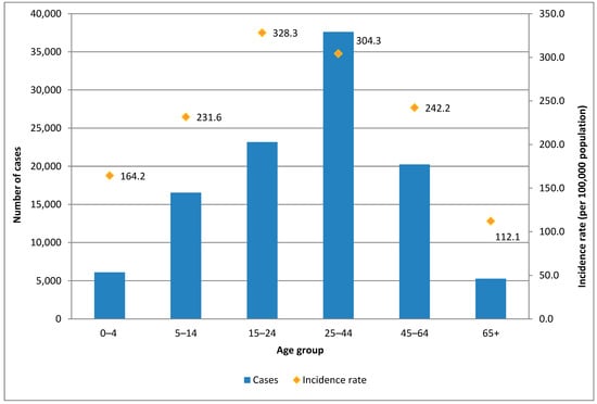 The age group between 25 and 44 years old showed the highest number of cases in the analyzed period (34.2% of the total). The group of 15- to 24-year-olds followed it, representing 21% of the total for the period. A similar proportion of cases was observed in the 45- to 64-year-old group (18.4%); the 5- to 14-year-old group accounted for just over 14%, and finally, the extremes of life (<5 years old and ≥65 years old) represented around 5% of the total cases each. Since these age groups are not homogeneous in terms of the number of cohorts and individuals included in each group, a cumulative incidence rate for the entire period was estimated to better represent the impact of dengue in each age group, considering the total number of cases for the entire period and the average population in each age group. Thus, the age group of teenagers and young adults (15 to 24 years old) had the highest cumulative incidence rate for the total period, reaching 328.3 cases per 100,000 inhabitants. They were followed by working-age adults and then children aged 5 to 14 years old (Figure 3). This pattern was consistently observed across almost all seasons, irrespective of the case count. A subtle variation in the age distribution of cases was noted during the 2010/11 and 2015/16 seasons, wherein a secondary peak in cases among the 0–4 age group occurred that followed in magnitude the peak observed in adolescents and young adults.