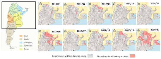 This territorial expansion can be clearly observed when the number and location of departments and provinces with autochthonous dengue cases are analyzed throughout the entire period. Thus, out of the two main outbreaks, provinces with dengue ranged between 5 and 12. However, during the 2015/16 and 2019/20 seasons, the disease expanded from North to South and West, and autochthonous dengue cases were reported in 15 and 16 provinces, respectively (Figure 4).