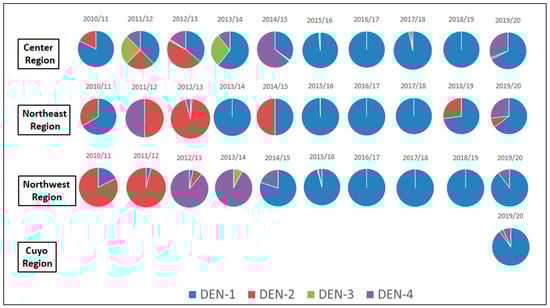Proportional distribution of identified dengue virus serotypes by region. Argentina. Seasons 2010/11 to 2019/20. N = 9567. Source: authors’ own elaboration based on data from the SNVS. National Ministry of Health.