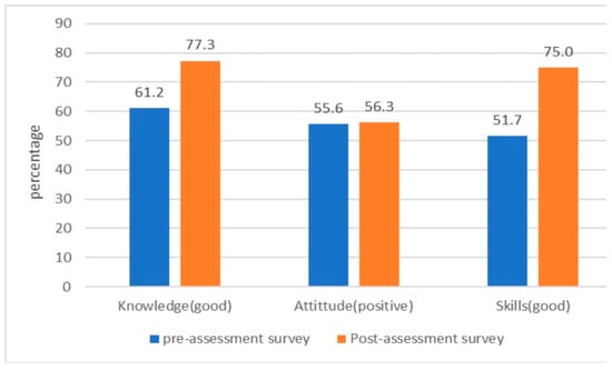 There was no significant difference in the mean attitude score of respondents after training (p > 0.05), and only a 0.7% increase in the proportion of respondents with positive attitudes was observed when comparing the pre- and post-assessment surveys (55.6% vs. 56.3%, respectively) (Figure 1)