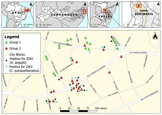 Area map with experimental design carried out in the study. Group 1—simple actions with the installation of two oviposition traps (one OVT and one Double BR-ovt) and capture by aspiration of adult mosquitoes monthly. Group 2—double actions with the installation of four oviposition traps (two OVTs and two Double BR-ovts), capture of adult mosquitoes by aspiration fortnightly and use of toxic sugar baits (TSBs) attached to oviposition traps. Black stars correspond to properties with Ae. aegypti mosquitoes positive for ZIKV, and blue stars Cx. quinquefasciatus mosquitoes also positive for this virus. In the study area (Nova Descoberta), Aedes aegypti was also monitored by sentinel-ovitraps (S-OVTs) as part of entomological surveillance from the Health Department of Recife. Source: the authors, from QGIS software version 3.16.