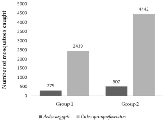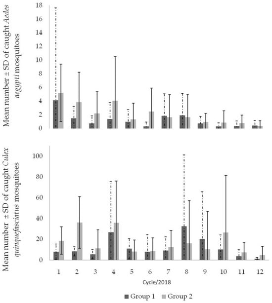 The number of properties evaluated throughout the study decreased, from three to nine properties in group 1 and a maximum of two properties in group 2 due to properties being closed on operator visit days (Table 1). Regarding the number of properties investigated in group 1, less than 10 of them were positive for Ae. aegypti and more than 14 properties were positive for Cx. quinquefasciatus. This characteristic was also observed in group 2. However, for Ae. Aegypti, it was reduced to six properties in the second half of the year, when TSBs were added to the control scheme, except in September 2018. In the last evaluation cycle (December 2018), only one property in this group was positive for the same species. The interventions led to a cumulative reduction of 90% and 98% in groups 1 and 2, respectively, after one year of control. These results reveal the impact of joint actions on the elimination of adult Ae. aegypti and, consequently, the reduction in mosquito–human contact, also mentioned by residents of the properties studied. The same control effectiveness was not registered for Cx. quinquefasciatus, although there was a reduction in the population density of adults when comparing groups 1 and 2 in the second semester. In addition, the presence of TSBs combined with traps prevented the explosive population growth observed in August and September 2018 (Table 1 and Figure 5).