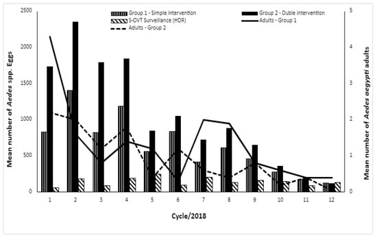Mean number of Aedes spp. eggs collected through oviposition traps (OVT), Double BR-OVT and Sentinel-Ovitrap (S-OVT), and mean number of Aedes aegypti adults captured by indoor aspiration. Group 1: simple control actions (n = 20 properties) and group 2: double control actions (n = 20 properties). Data collected from January to December 2018 (cycles 1 to 12). Source: entomological surveillance data from Health Department of Recife.