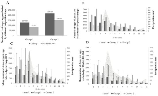 The total number (A,B) of Aedes eggs collected by different oviposition traps in the different evaluated groups. Data collected from January to December 2018 (cycles 1 to 12). Mean number of eggs collected through oviposition traps (OVTs) (C) and Double BR-ovt. Group 1: simple control actions (n = 20 properties) and group 2: double control actions (n = 20 properties) (D).