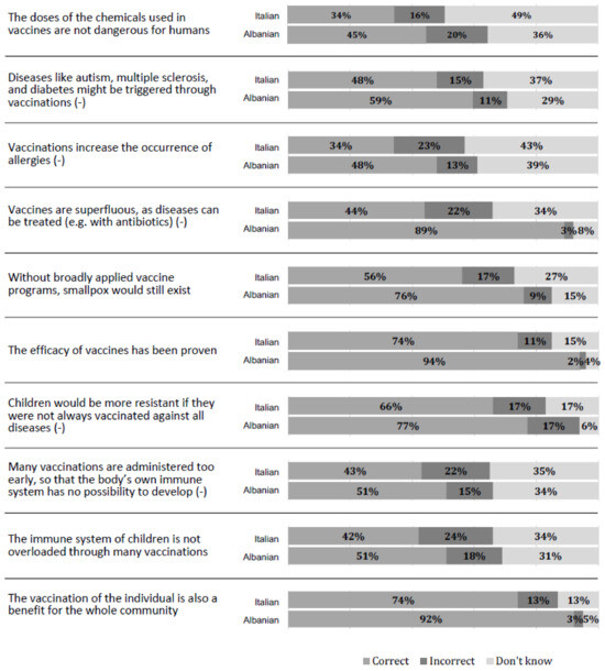 Concerning the assessment of general knowledge of vaccines (Figure 1), the mean score of the sample was 5.51 ± 2.66. Only 36 students (5.2%) answered all ten questions correctly. Knowledge was significantly higher (p < 0.001) among Italian respondents (6.65 ± 2.34) than among Albanians (4.72 ± 2.58). A significant difference was observed in the overall knowledge of vaccines score among different course years (χ2 = 90.058; df = 40; p = < 0.001) and different degree courses (χ2 = 89.932; df = 40; p = < 0.001), indicating that students attending higher years of courses and the Medicine and Surgery course, regardless of nationality, were significantly more informed about vaccination than students attending lower years of courses and other medical science courses.