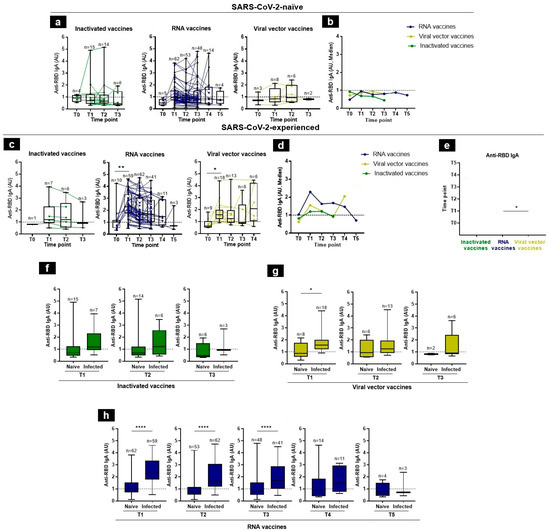 3.3. Anti-RBD IgA Kinetics Elicited by Different Vaccine Platforms in SARS-CoV-2-Naïve Individuals and in Those with Pre-Vaccination History of SARS-CoV-2 Infection