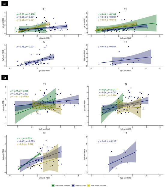 3.4. Association between Vaccine-Elicited IgG and IgA Responses