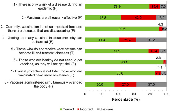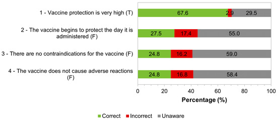 To characterize general knowledge about vaccines/vaccination, several statements were presented with the answer options “True”, “False”, and “Unaware”. For each sentence, a correct answer was considered when the study participants answered “False” in false statements or when they answered “True” in true statements. The distribution of answers can be seen in Figure 1.