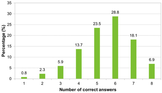 Regarding the number of correct answers about vaccines/vaccination, more than half of the participants (53.8%, 282/524) answered at least six questions correctly, but only 6.9% (36/524) correctly answered all the presented questions (Figure 2).